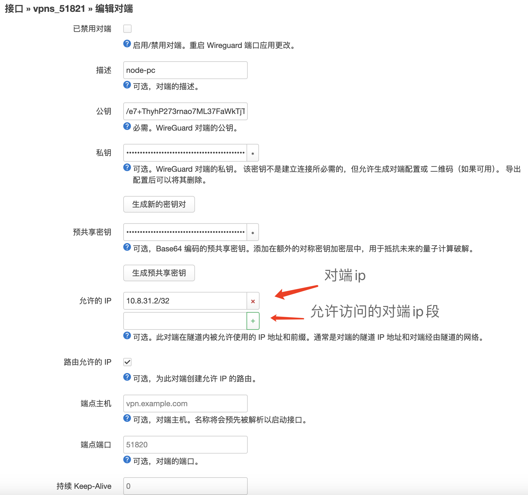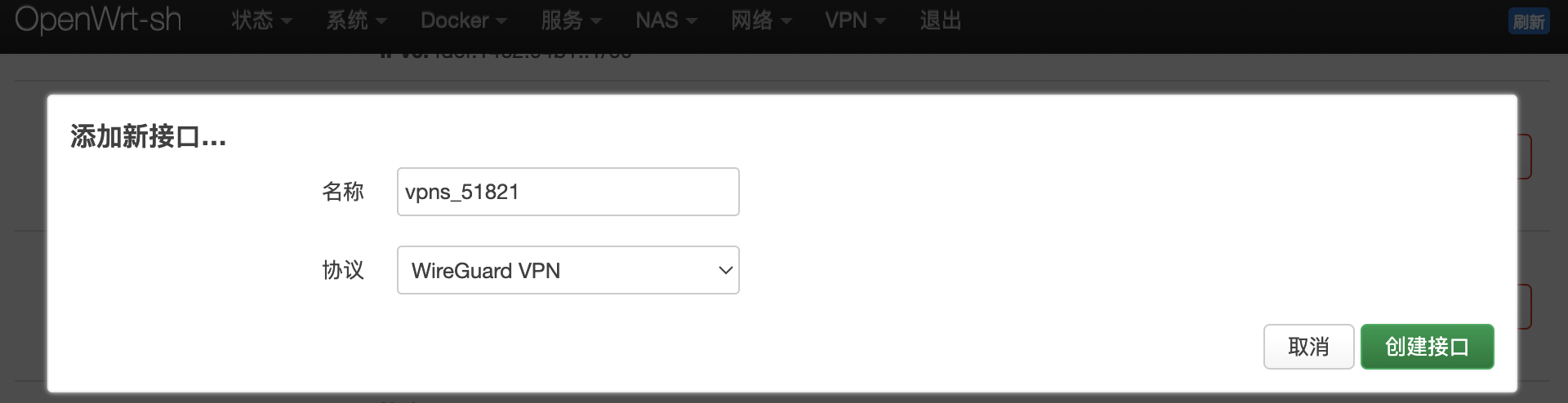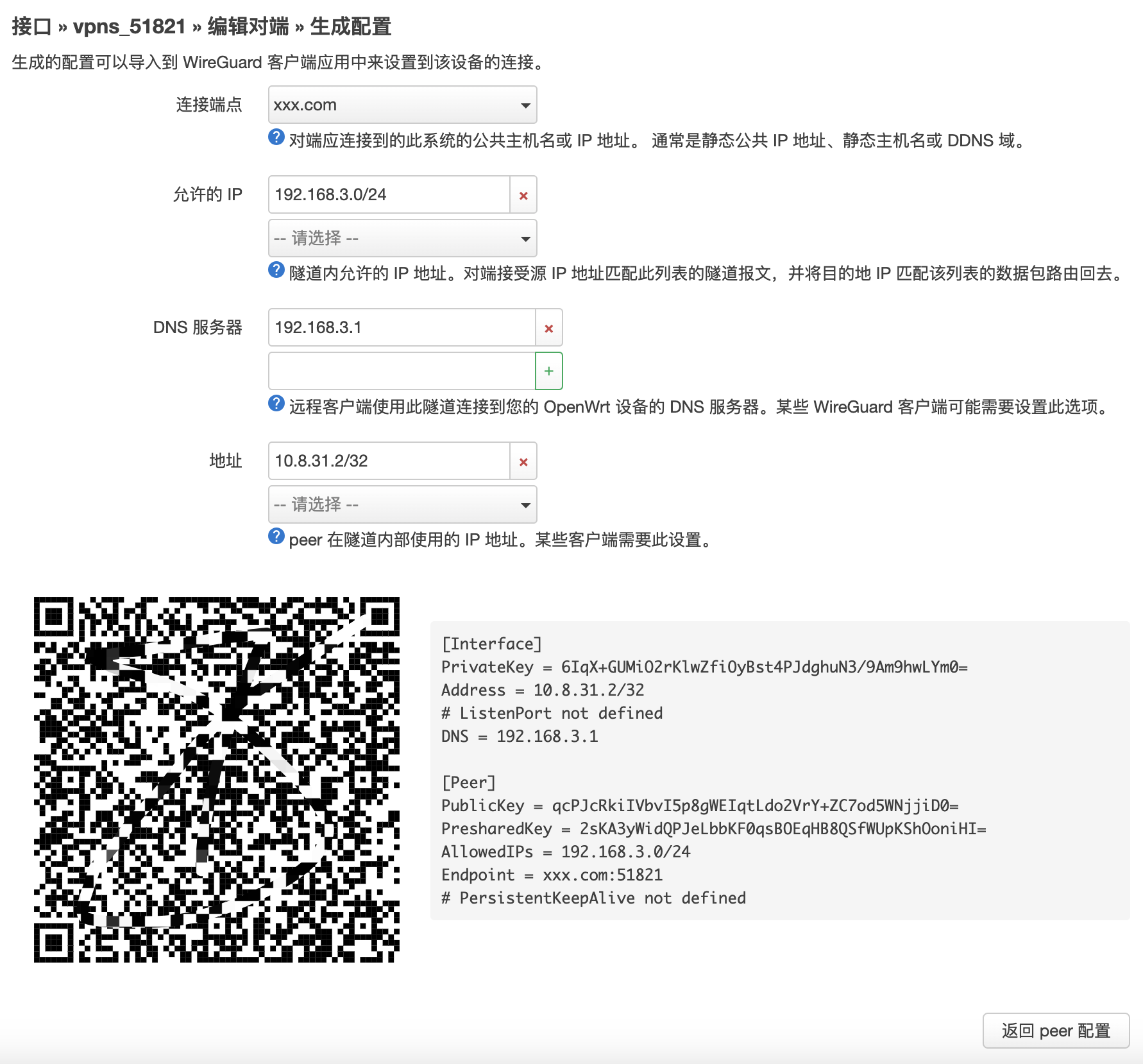 OpenWRT WireGuard 异地组网 发表于: 2024-03-31 分类于: openwrt 字数: 100 阅读:≈ 1分钟 浏览: 依赖 luci-proto-wireguardqrencode新建接口: 网络 -> 接口 -> 添加新接口 常规设置 防火墙设为lan 对端 -> 添加对端 生成对端配置 注 xxx.com为本端域名或公网ip地址添加对端时允许的ip不能填本路由所属的ip段,否则会导致无法访问本路由